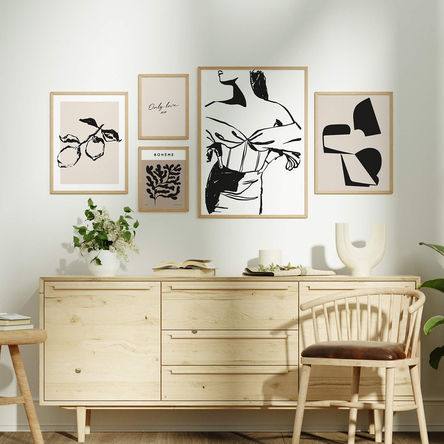 Deze posterset brengt een elegante en artistieke sfeer in je interieur met vijf zwart-wit ontwerpen. De set bevat abstracte en figuratieve afbeeldingen, evenals inspirerende teksten in minimalistische stijl. De eenvoudige kleuren en strakke lijnen zorgen ervoor dat de posters perfect bij elkaar passen, wat een samenhangend en verfijnd geheel vormt. Ideaal voor het verfraaien van je woonruimte, slaapkamer of kantoor, deze set voegt een gevoel van stijl en verfijning toe aan elke ruimte.